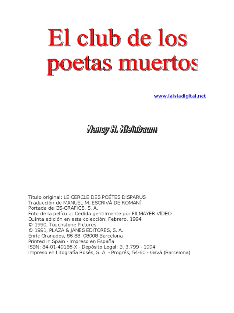 El Club De Los Poetas Violentos! Entre las producciones más interesantes sobre aquella está, por ejemplo, el club de los poetas muertos.peter weir fue quien en 1989 dirigió la misma que gira entorno a una clase de literatura, a sus alumnos y a su profesor quien intenta enseñarles que deben luchar por sus sueños y que deben vivir de la mejor manera posible el presente.